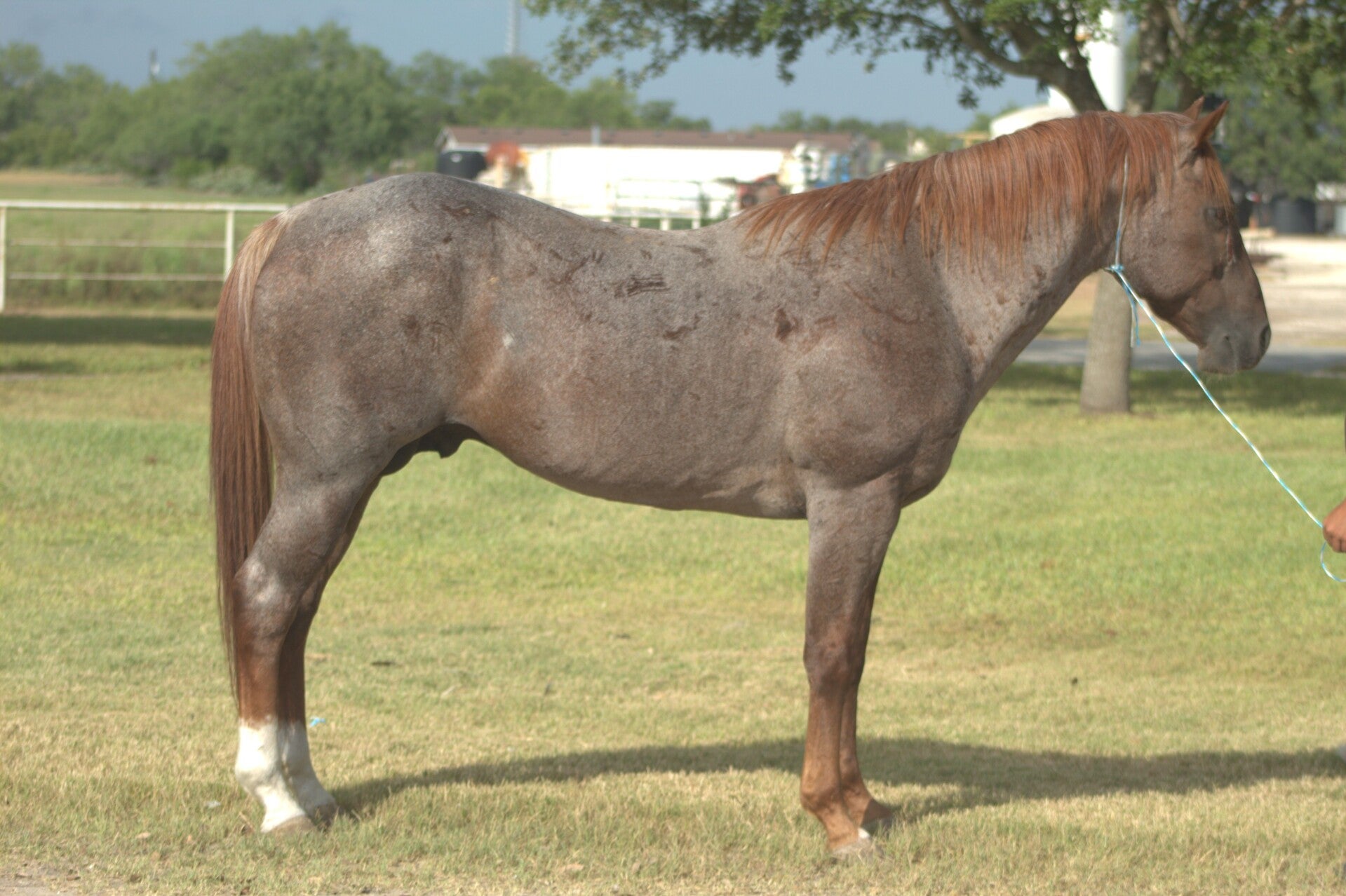 2-year-old Bay Roan filly with two hind socks. This unique filly is built correct with straight legs, good bone and a wide chest. She has been willing, intelligent and curious. This filly will be quick, athletic and will have the ability to be very diverse.